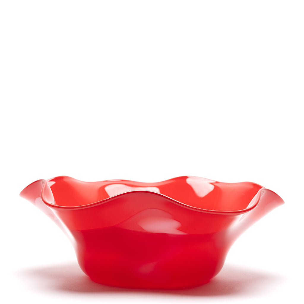 This one of a kind bright red wavy bowl is accented with powder white and light rose strokes. Each glass vessel is carefully hand blown and shaped. This piece stands artfully on its own or can be used to hold a low flower arrangement or a bounty of fruit as a centerpiece.